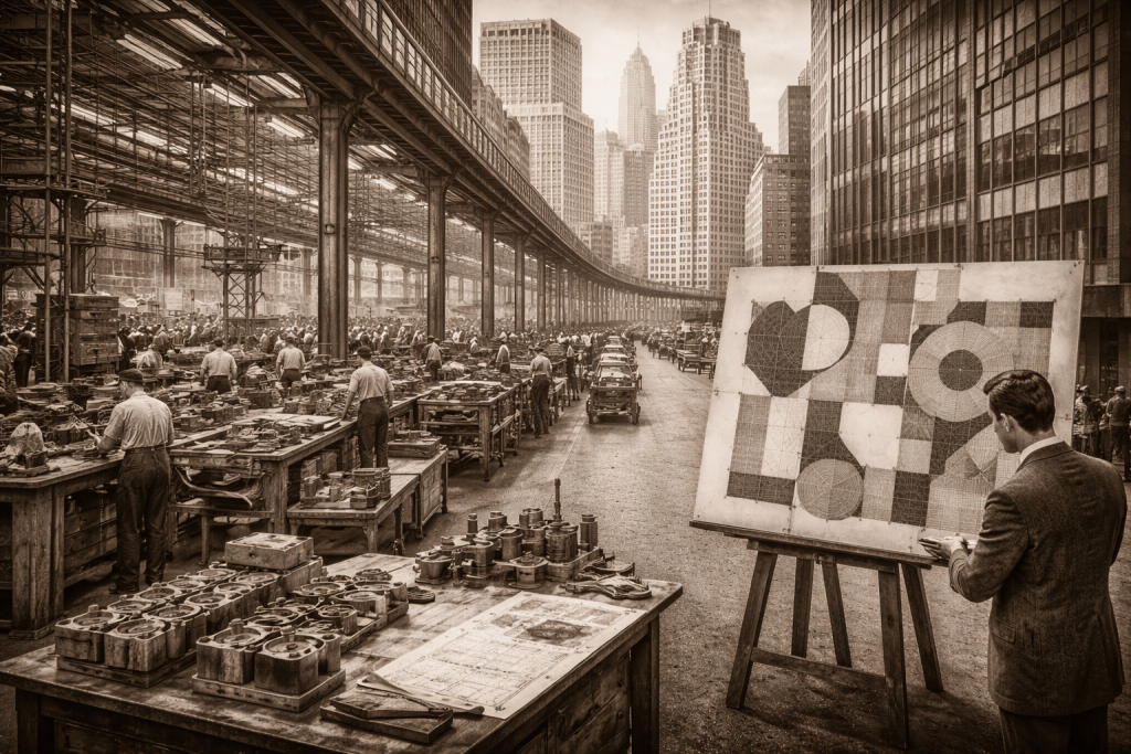 几何抽象艺术并非孤立出现的风格创新,而是二十世纪初多重历史条件共同作用的结果。它既源于艺术语言自身演化的内在逻辑,也深度嵌入于现代性进程所引发的技术变革、社会结构调整与思想观念转型之中。只有在这些条件相互叠加的语境下,几何形式才得以从自然再现的附属工具,转变为独立的视觉本体。首先,技术条件的变化构成了几何抽象诞生的重要外部推动力。摄影与印刷复制技术的成熟,使绘画逐步失去了对现实再现的垄断地位。当再现自然不再是绘画不可替代的功能时,艺术开始转向对自身语言本体的探索。几何形态因其非再现性与高度可控性,成为这一探索过程中最具潜力的形式资源,为抽象艺术的形成奠定了技术语境基础。其次,科学理性与现代数学观念的普及,为几何抽象提供了深层认知框架。非欧几何动摇了传统空间观念,使空间不再被理解为绝对静止的容器,而是可被建构与重组的结构系统。这一观念变化影响了艺术家的空间想象,几何不再只是测量工具,而被视为理解世界结构的一种模型。艺术家开始用比例与网格关系来组织画面,使绘画从自然表象转向抽象秩序的可视化表达。第三,工业化与城市化进程改变了人类的视觉经验结构。大规模工业生产带来了标准化与模块化原则,城市空间充斥着直线、矩形与机械节律,这种环境重塑了人们对形式与秩序的感知方式。在这种背景下,几何形态逐渐成为现代生活的视觉常态。几何抽象艺术正是在这一经验土壤中获得现实基础,它将工业文明中的结构逻辑转译为艺术语言,使形式本身成为现代性精神的象征。