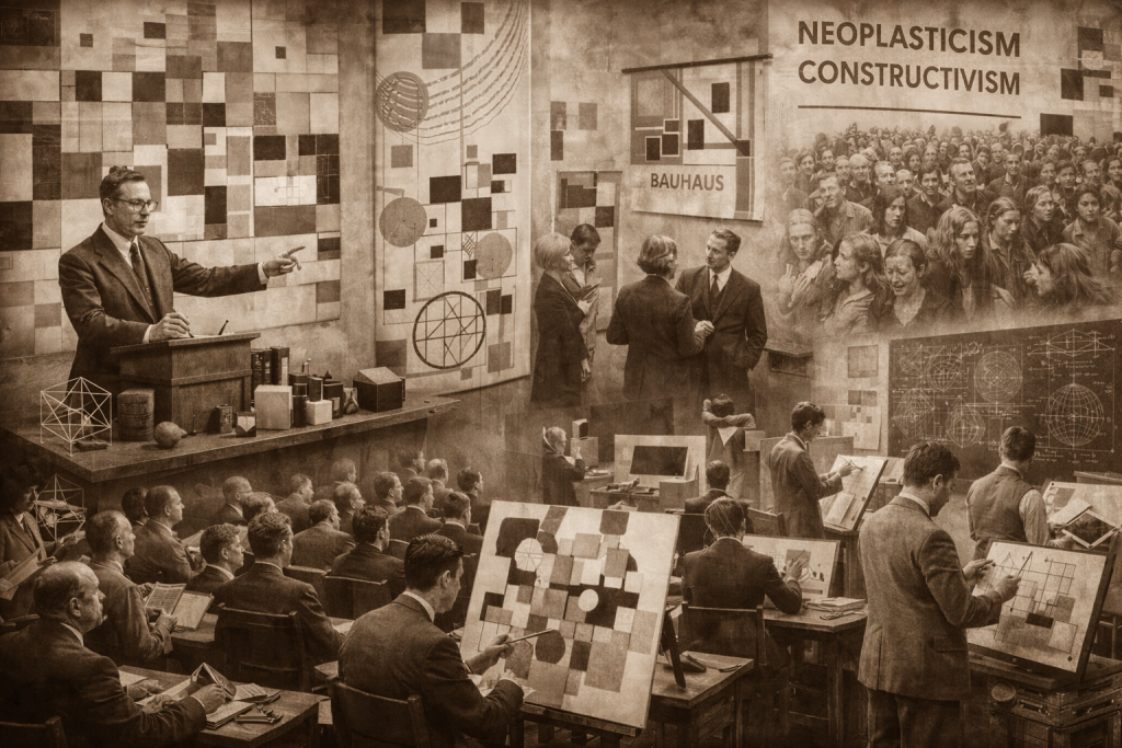 最后,艺术体制与先锋网络的形成,以及社会危机所引发的秩序焦虑,共同为几何抽象提供了传播动力与心理动因。包豪斯、新造型主义与构成主义等运动,将几何原则系统化为方法论,并将其引入建筑、设计与教育体系之中,使几何抽象从个体实验上升为具有公共合法性的艺术范式。与此同时,面对不稳定现实,几何抽象所呈现的理性结构与形式纯度,被视为一种象征性的秩序重建方案,在形式层面回应了现代性带来的存在焦虑。